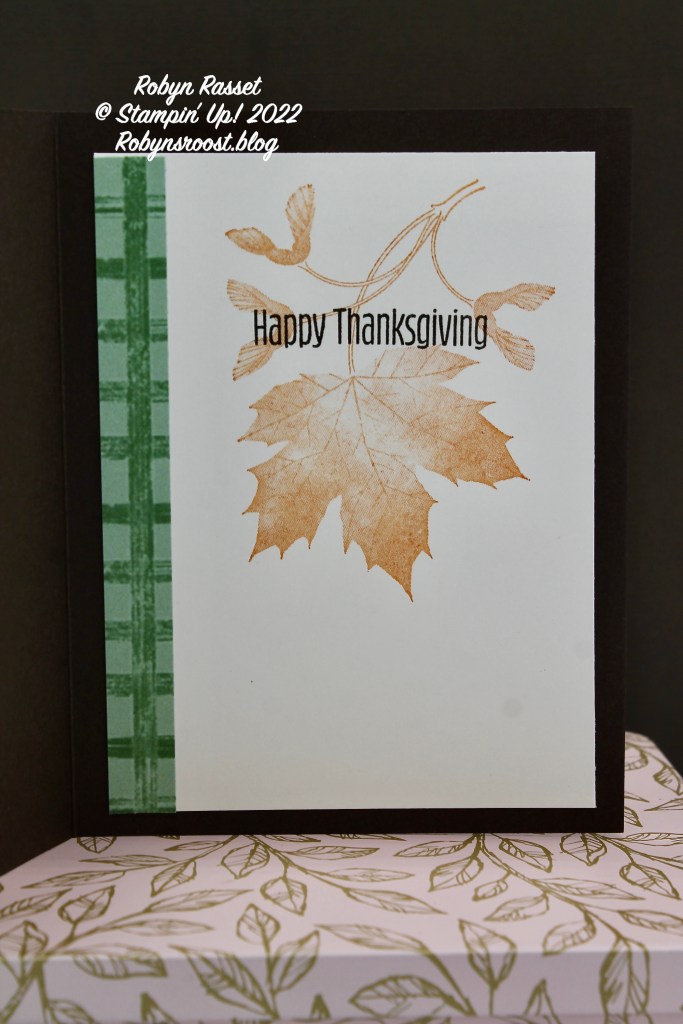 The inside of the card is decked out in Fall colors too, with a stamped off (ink up the stamp and stamp onto a scrap first, then without reining stamp onto your paper for a lighter image) Pumpkin Pie leaf from the Soft Seedlings stamp set (front hello greeting is from this set) and a Happy Thanksgiving greeting from the Gift of Fall August 2019 Paper Pumpkin Kit. I love my Paper Pumpkin stamp library!