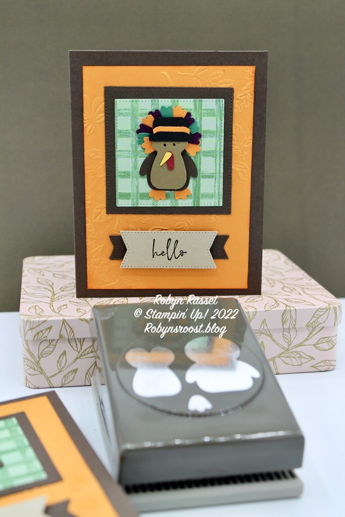 This turkey is created by trimming and snipping various pieces punched from the Penguin Punch. Want to make your own gobbler? Watch my Turkey Punch Art Video Tutorial for step-by-step instructions. For more ideas on using the Penguin Builder Punch watch Dawn’s video here.