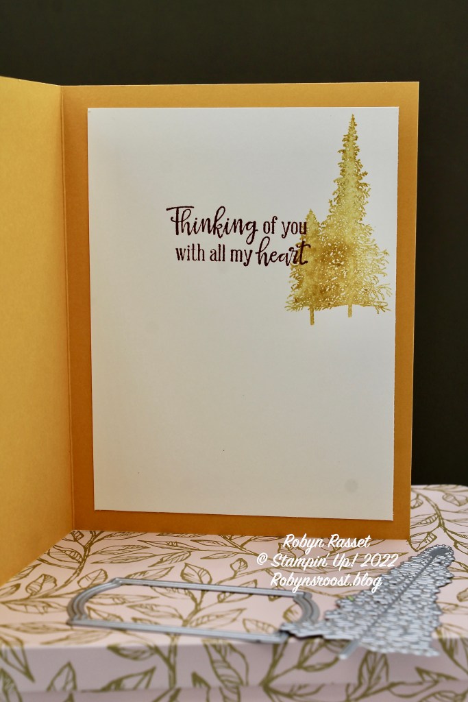 The greeting on the inside is also from the Peaceful Moments stamp set and is done in Cajun Craze ink. The trees are done in Mango Melody ink and were stamped off on the grid paper first to give a lighter image.