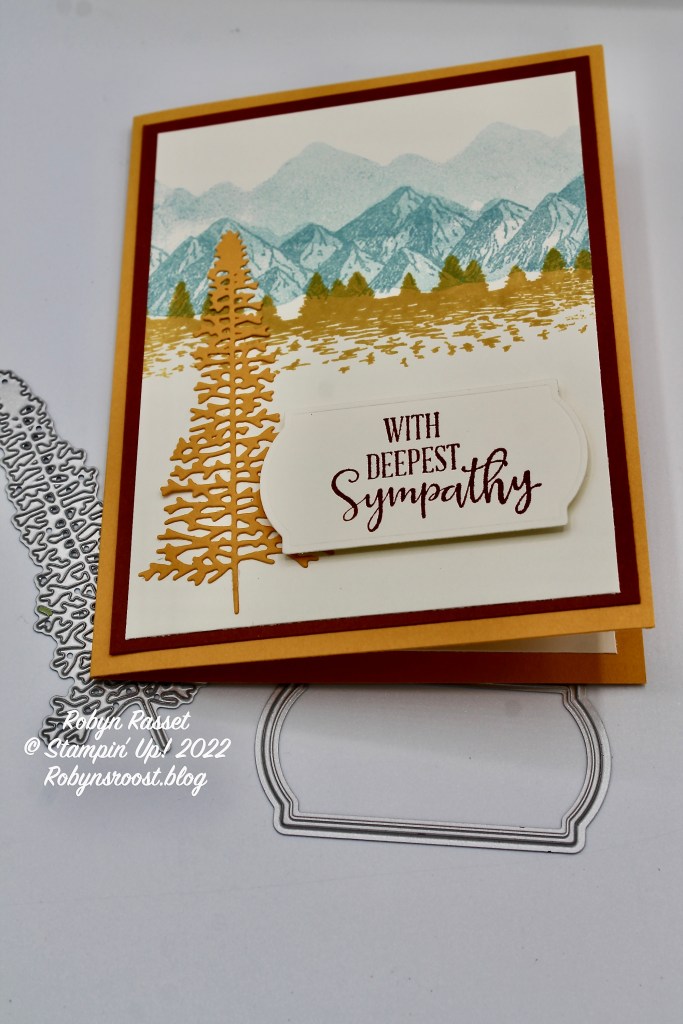 Next, I die cut a tree from the Majestic Mountains Die set in Mango Melody paper. This tree reminds me of the Tamarac forest that was beside my house where I grew up. In the summer it was a magical moss covered swap where I always imagined fairies lived. In fall it would turn into this glowing golden forest. It was so pretty when the sun hit the trees, I was sure that the fairies sprinkled gold pixie dust on them. The greeting from the Peaceful Moments stamp set is stamped with Cajun Craze ink and die cut with one of the dies from the Painted Labels Die set.