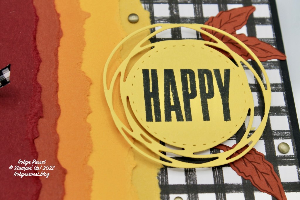 The 5 colors in bold (above) are torn on one edge and then layered together to overlap. The greeting label and leaf dies are from the Painted Labels Die set. The Black & White Gingham ribbon echoes the designer paper.