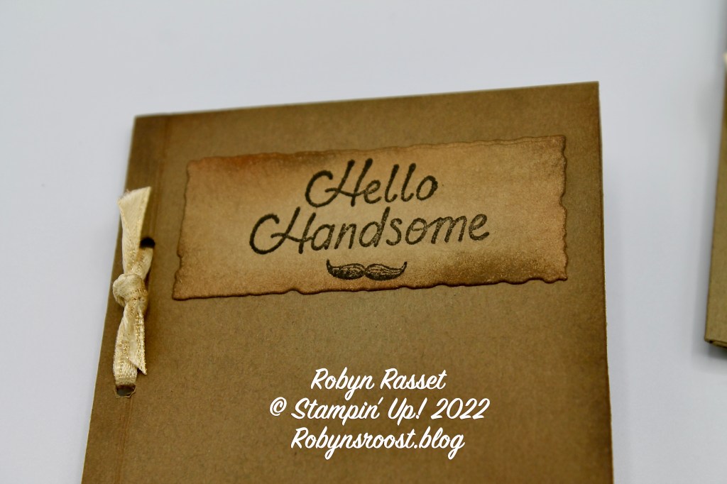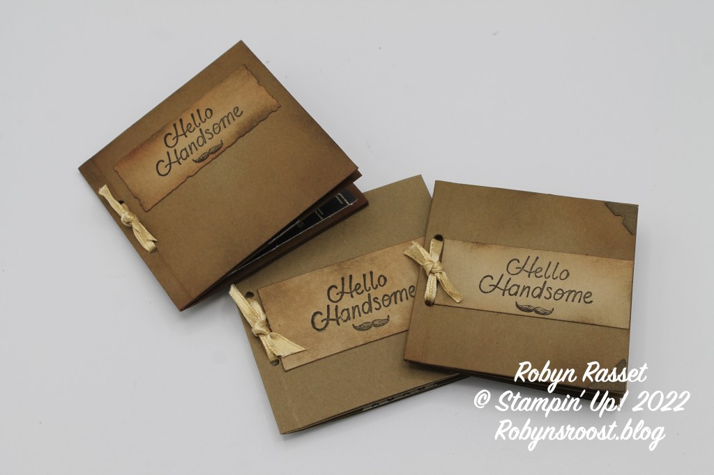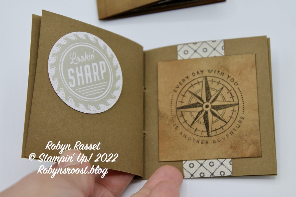Do you find masculine cards hard to make? This little card came to me when I was trying to come up with cards using the He’s All That stamp set. It’s a little mini book that fits into the 3″ x 3″ envelopes.