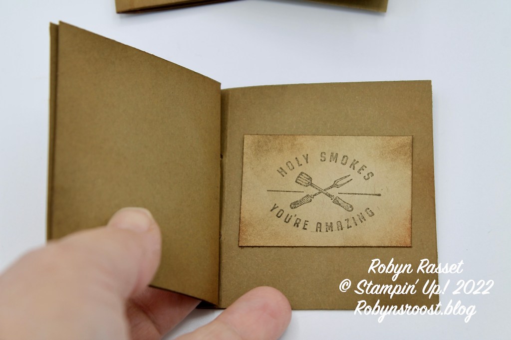 The He’s The Man Designer Series Paper has two sheets of fun die cuts, many of which fit perfectly in this mini book. This is one of the first mini books that I made which are 3″ x 3″. The book itself doesn’t have the faux leather technique done on it on this one. The Holy Smokes layer is 2″ square and the designer paper layer is 2 1/4″ square.