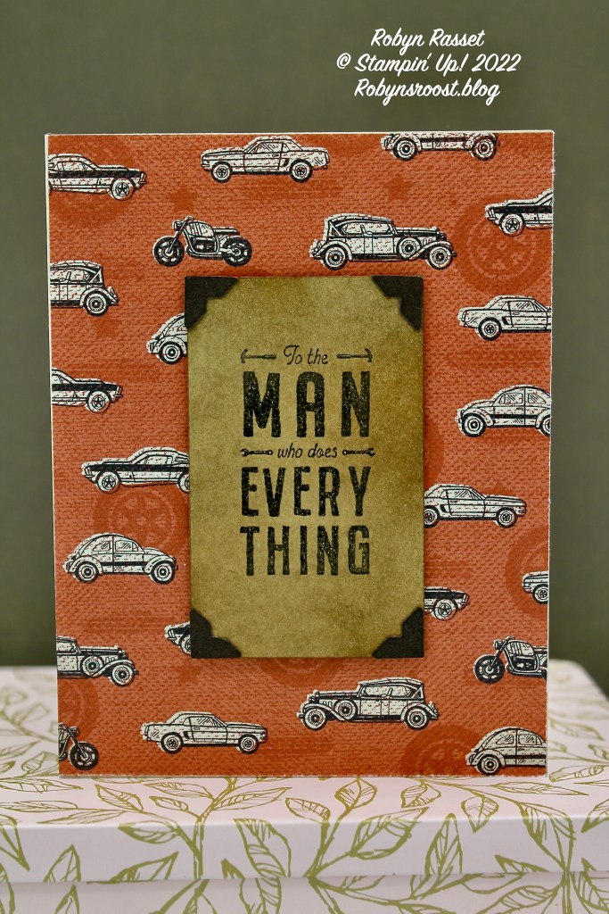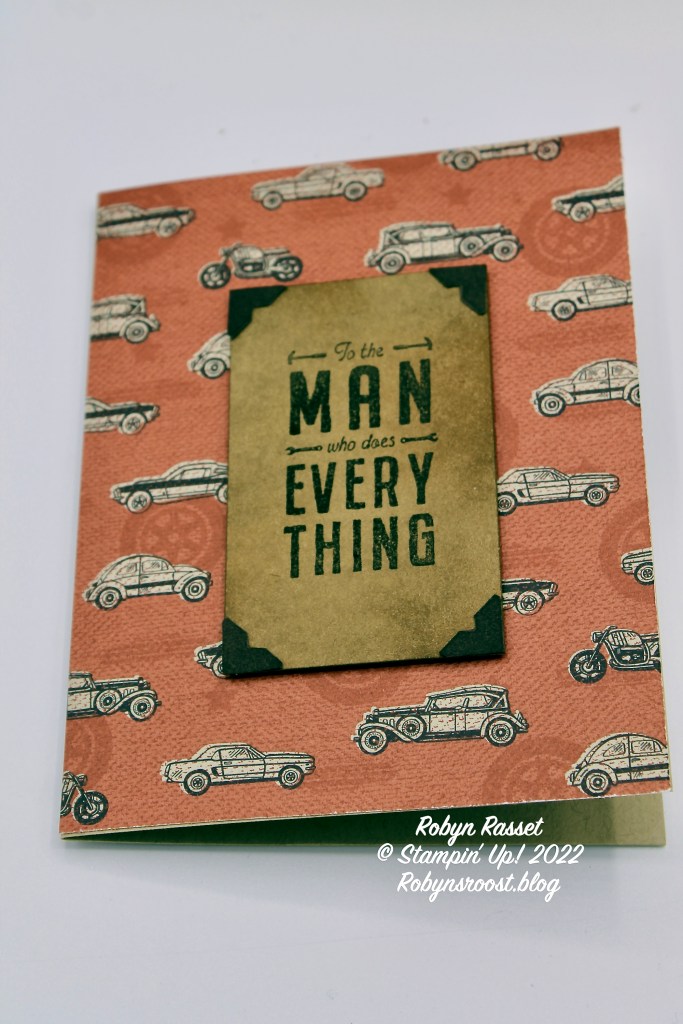 For this card, I used a crumb cake card base and covered the front with a 5 1/2″ x 4 1/4″ piece of the He’s The Man Designer Series Paper with a classic car motif. The Faux Leather layer is 2″ x 3 1/4″ and the greeting is stamped with Early Espresso ink. The little corner protectors are inked with Early Espresso ink on Early Espresso cardstock and were then fussy cut. I love this greeting! It is so perfect for my hubby! He’s the guy that fixes things.