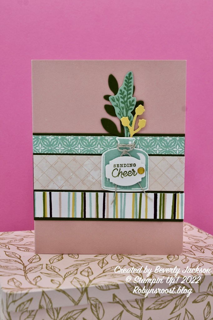 Bev’s card uses the fun Bottled Happiness Bundle combined with the Design A Daydream Hostess Reward paper pack. I love the combination of the three patterns that she has chosen with the different widths all mounted on an early espresso layer with it peeking between each strip.