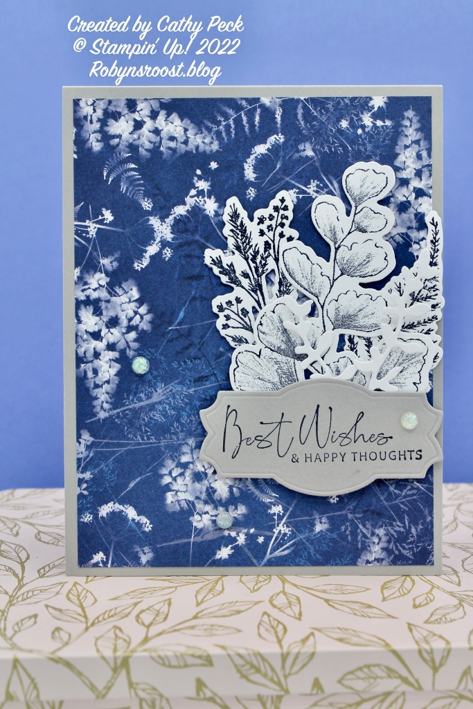 This pretty wedding by Cathy would be perfect for a winter wedding! The Sun Prints Designer Paper in the cool blues and whites with the gray base and greeting are classy. The foliage done in blues on white card stock adds a nice contrast to the grays.