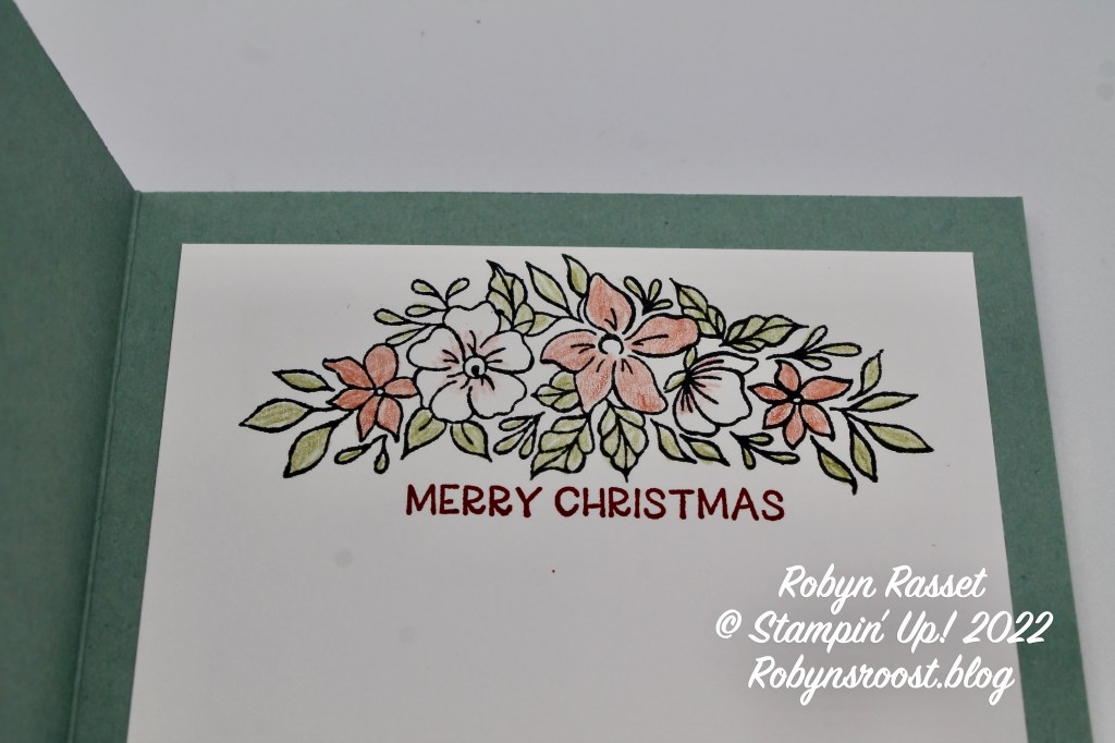 For the inside of the card Watercolor pencils were used to lightly color the floral image from the Fitting Florets stamp set and the greeting was stamped in Real Red ink.