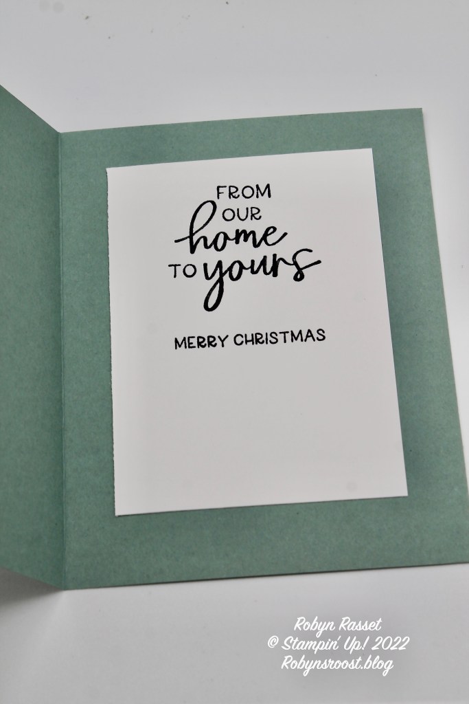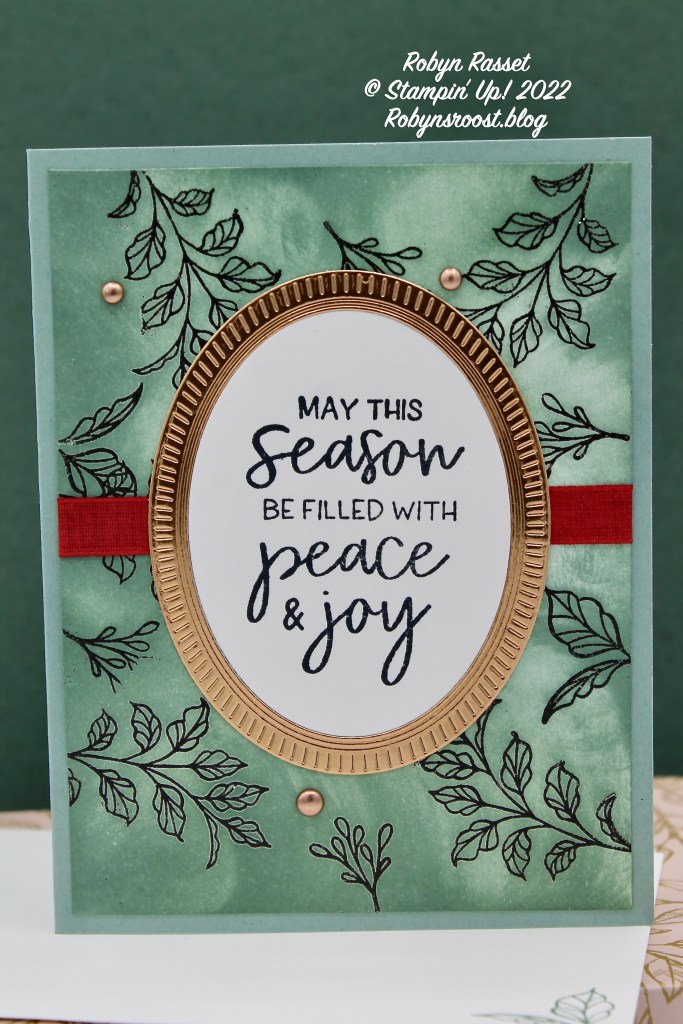 For this Embossed Resist piece, VersaMark ink was used with Black Embossing Powder. Then a Blending Brush was used to add color to the Basic White background. I love how the leaves seem to pop off the paper. The copper foil frame and white inset were bot die cut using the same die from the Framed Florets Dies. The copper colored Brushed Metallic Dots help draw the eye into the frame and greeting.