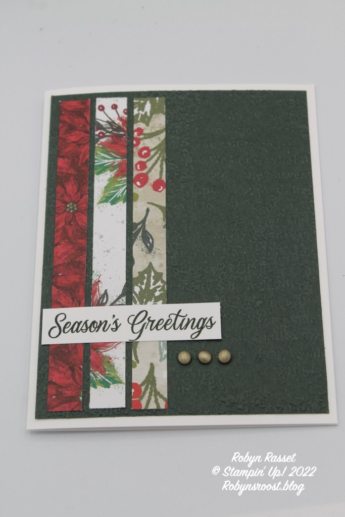 Today’s card is an easy to mass produce Christmas card layout. The background can be embossed or left plain. Use the same patterned paper for all three strips or use coordinating different patterns.