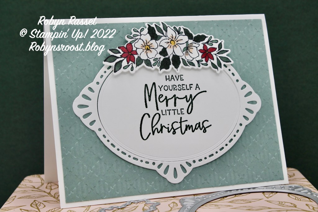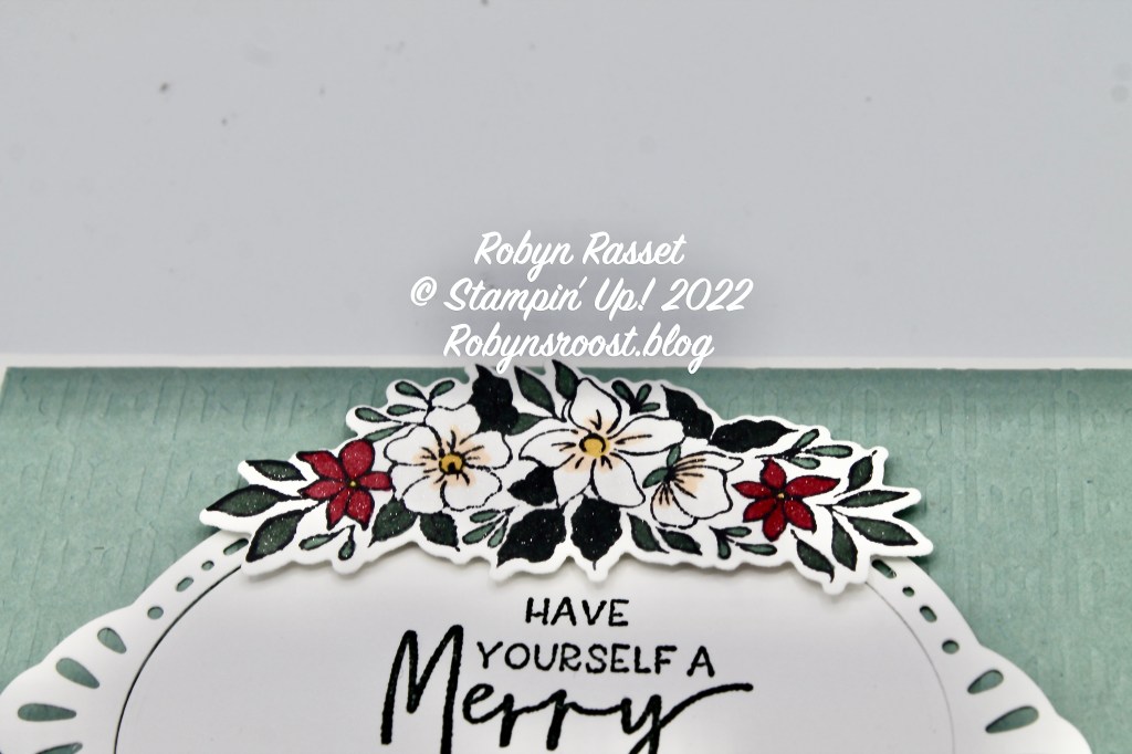 The Framed Florets stamp set is a photopolymer (clear) stamp set with floral images and year round greetings. The coordinating Framed Florets Dies have dies to cut out the floral images and some beautiful oval frames. The second stamp set is the Framed & Festive set which is made of red rubber and is all Christmas greetings which fit nicely in the oval frames. The collection is rounded off with some shinny Gold Adhesive Backed Gems and the gorgeous Fitting Florets Designer Series Paper.