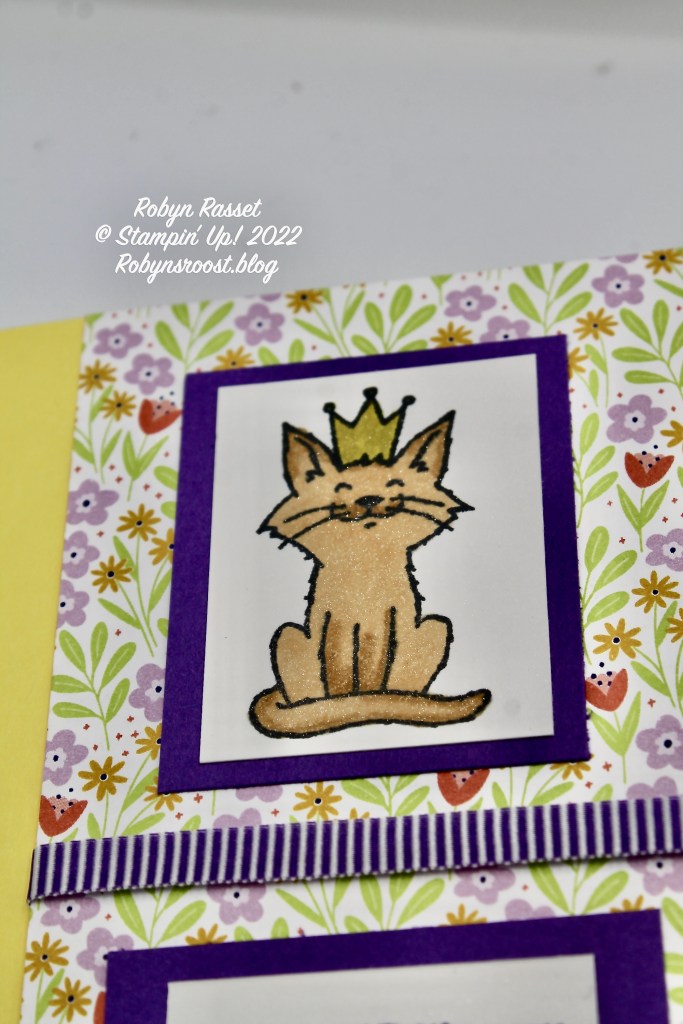 Miss kitty is colored with Natural Tones Stampin’ Blend Markers and covered with Wink of Stella for a royal glitter. Here are the paper dimensions used: