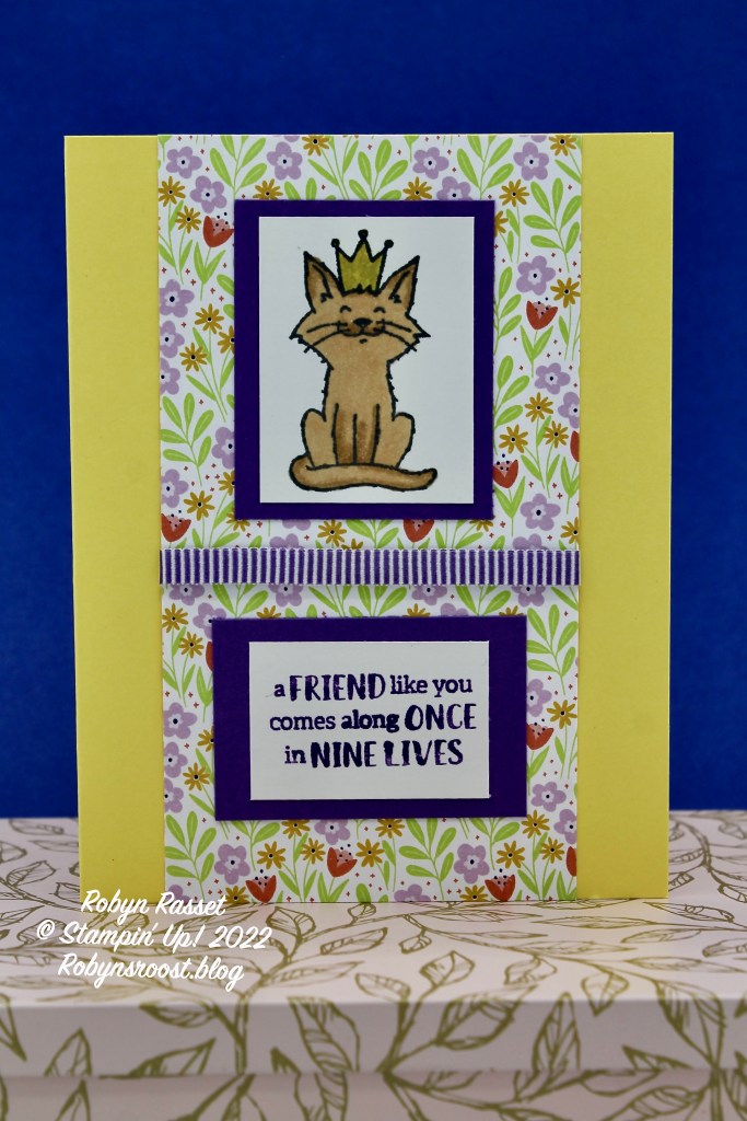 Here’s another card using the Glad We’re Friends stamp set, this one with a cat theme. I may have admitted before, I’m a dog person, but please, don’t tell my cat. Her name is Princess and she is white and gray. This card feature a Siamese cat.
