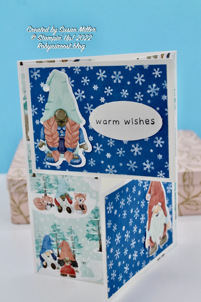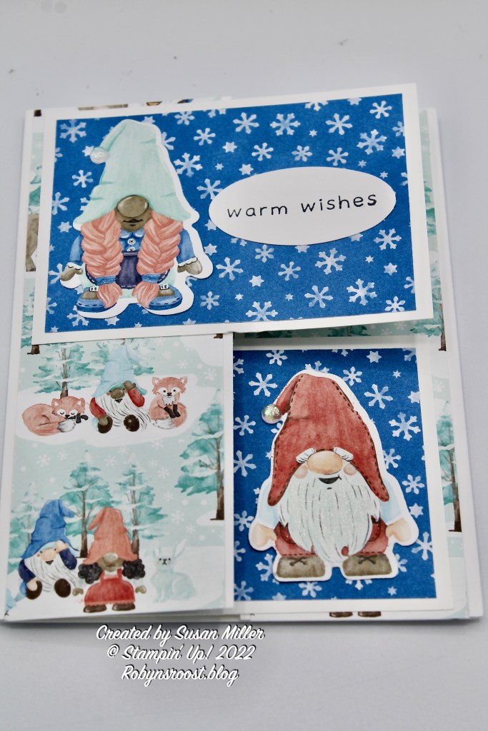 This Bi-Fold Gnome card by Susan Miller is put together a bit differently than expected. It starts with a card base that is 8 1/2″ x 5 1/4″ scored at 2 1/8″ and 6 3/8″ for a standard Bi-Fold card. The two flaps are 2 1/2″ x 3 3/4″ and are adhered to the card front so that the bottom one closes behind the Bi-Fold and the topple closes on top of the Bi-Fold.