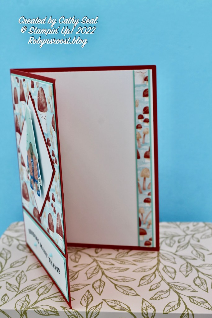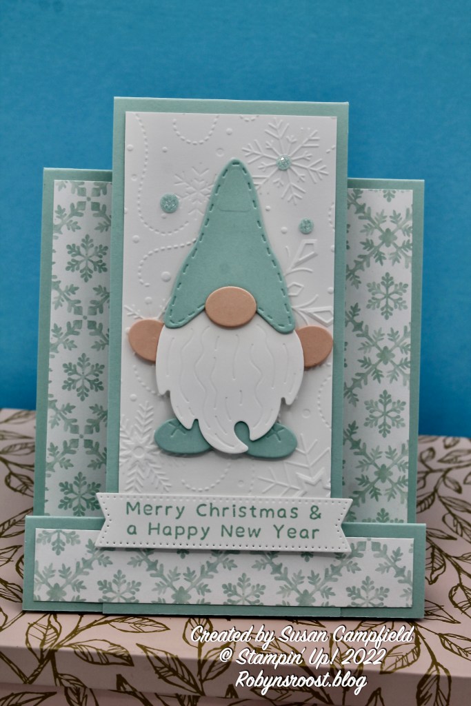 This fun step card is going to be included at my next Creative Cards Class (but probably without the Gnome). Susan Campfield always does such precise work! The base is 11″ x 4 1/4″ scored at 1″x 2″ and 6 1/2″. The fold over part is 2 1/2″ x 81/2″ scored at 3″. I promise I will be sharing this fun fold on a different card next month.