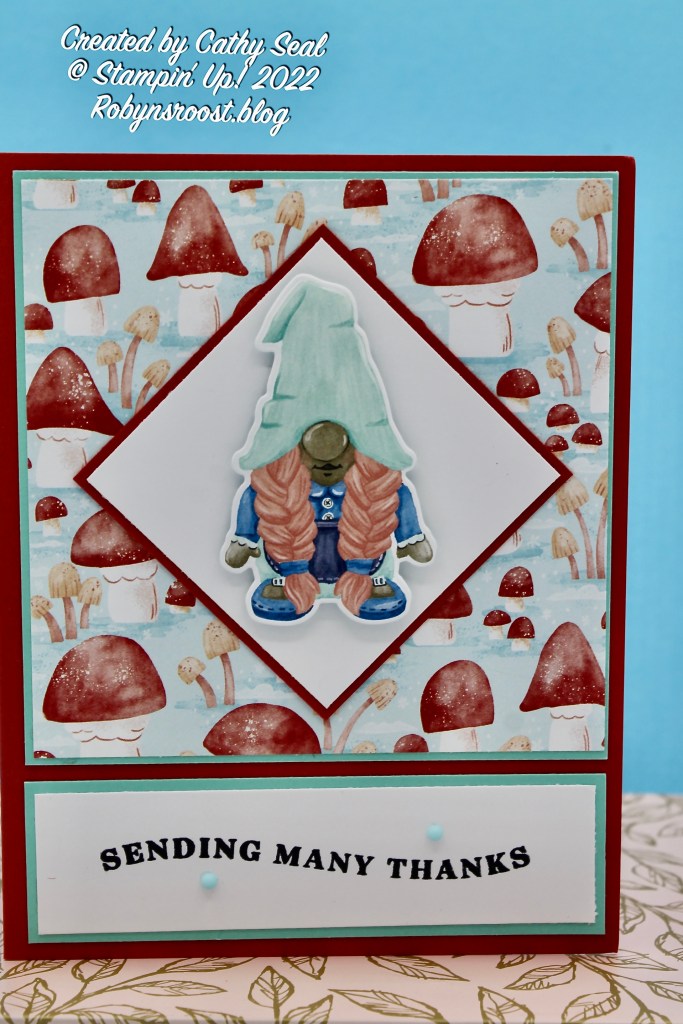 Today’s swap card are all a bit Gnomish! They all feature items from the Storybook Gnomes Suite. I’m not sure why but I find Gnomes in general a bit creepy, sort of like clowns, I guess. I do have to admit that these Gnomes are kind of cute. I did purchase the paper but couldn’t bring myself to buy the stamp set, lol.