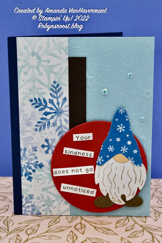 Amanda has used the Wintery 3D embossing folder, which I don’t have, and it’s on the SEASONAL SALE! Add that to the list! We have until midnight tonight to keep adding items, hehehe. That’s an embossing folder that I totally overlooked! The other neat thing on Amanda’s card is the way that she added color to the gnomes beard. It looks like she added the ink to the die when cutting out the beard.