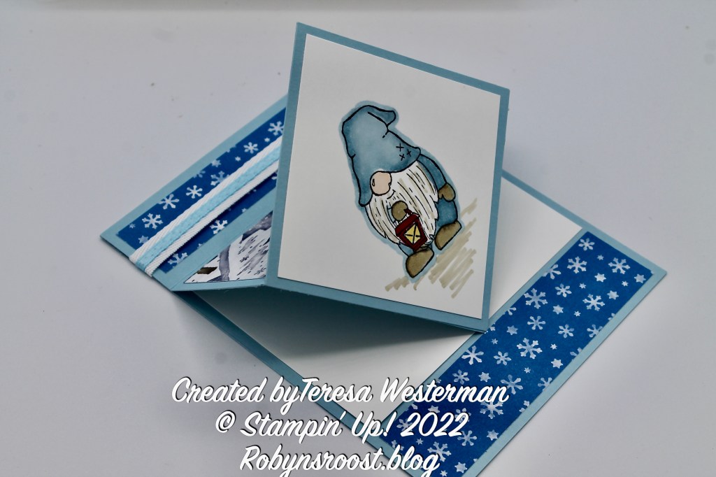 Teresa’s car is another fun fold that is going to be CASE’d for my December card class! This is a spin on the Book Fold Technique, which turns the card to a portrait orientation and adds an easel. Wow, how cute is that? The base is 11″ x 4 1/4″ scored at 2″, 4 1/4″, and 5 1/5″. The Gnome is layered onto a 3″ square. Watch for a video tutorial on this one next month as well.