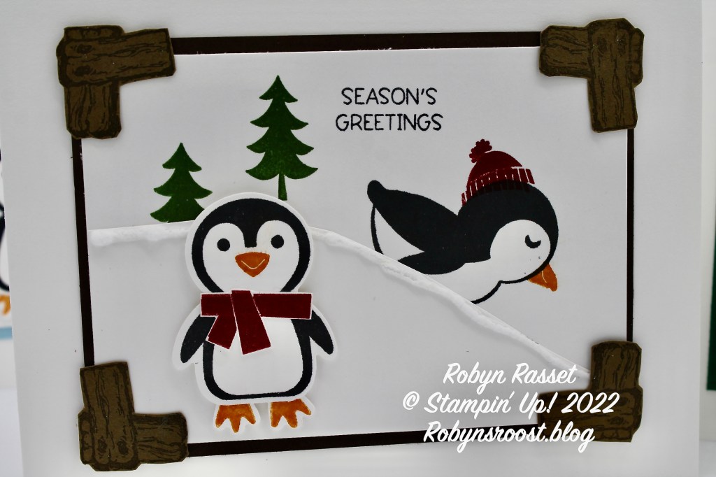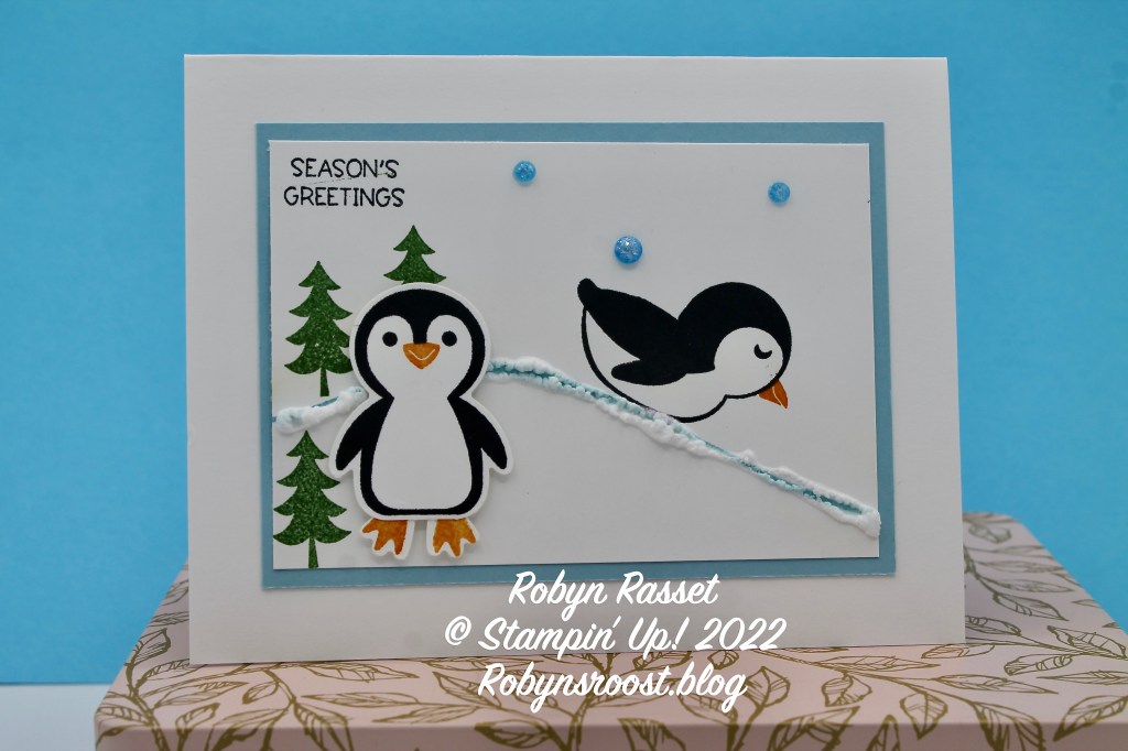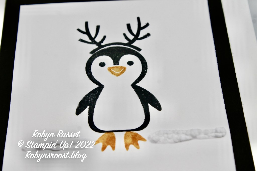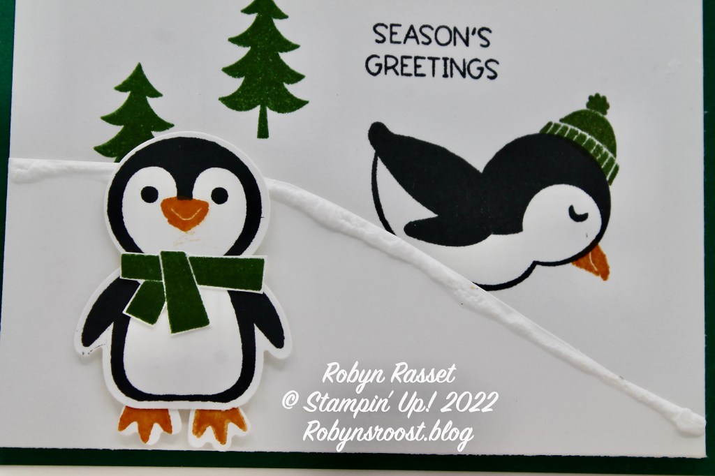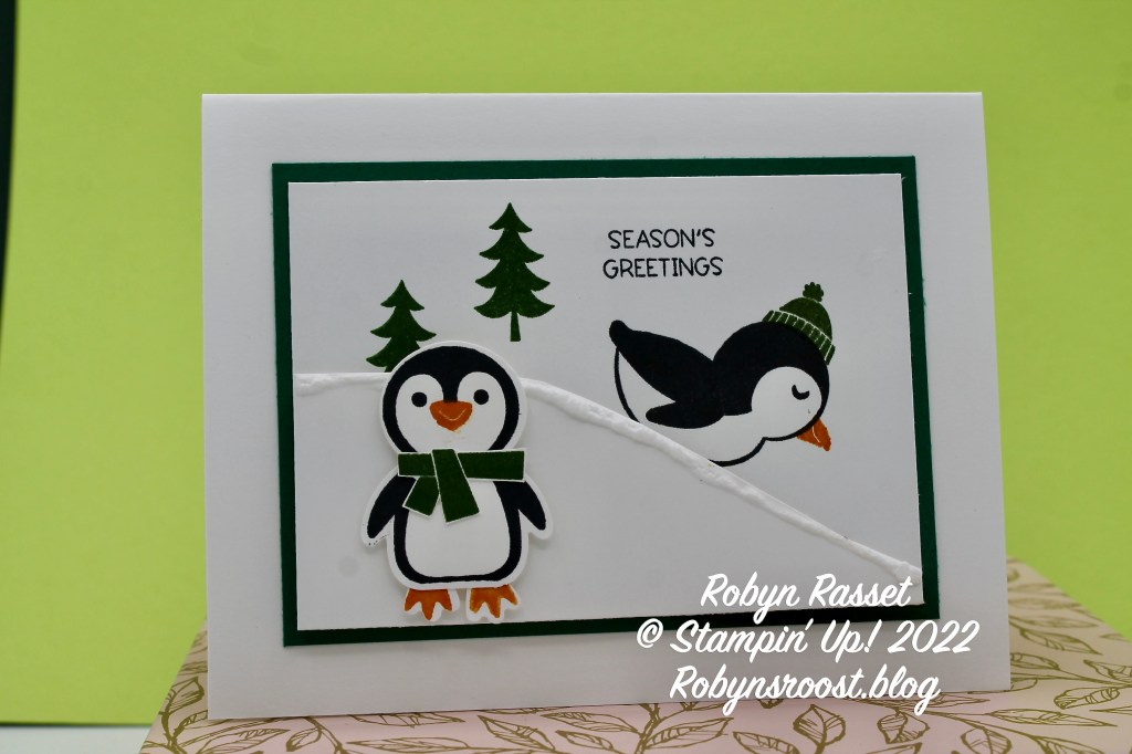 This card is the one that I created during the video tutorial. The sliding hill is popped up with dimensionals and the front penguin is also popped up. Instead of stamping the feet, they are simply punched from Mango Melody cardstock with the Penguin Builder Punch. All of the standing penguins were created with the Penguin Builder Punch.