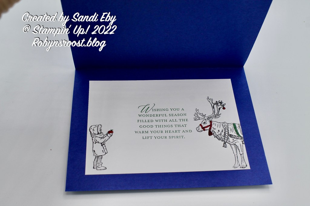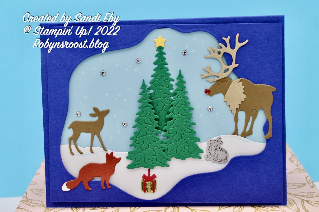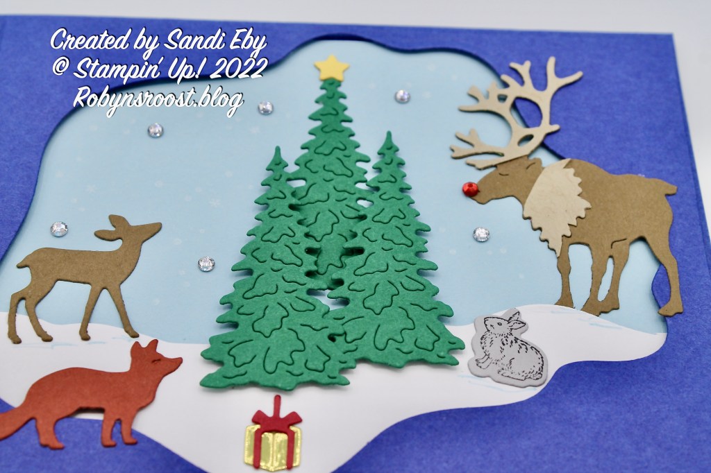 Yesterday’s Regal Reindeer card was done in white and today’s Regal Reindeer card by Sandi Eby is all about color! Sandi has skipped the harness and made the reindeer antlers and ruff in a lighter color by doing some extra die cutting and a little fussy cutting. The little doe on the left side is a visitor. She is from the Grove Die set but fits right in with this woodland scene.