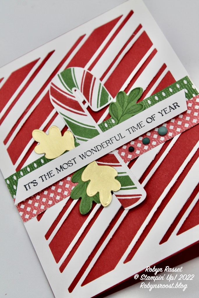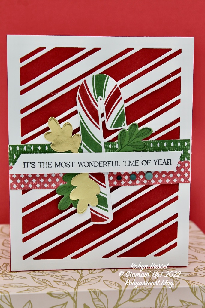I did find that I needed a shim in my die sandwich when cutting the large striped background. It also helped to carefully turn the die and run it through sideways so that the roller hit differently. I find that its worth the extra trip through the die machine to get nice clean cuts! This candy cane is die cut from the Sweetest Christmas designer series paper but there are also stamps and dies in the set to create candy canes facing either direction.