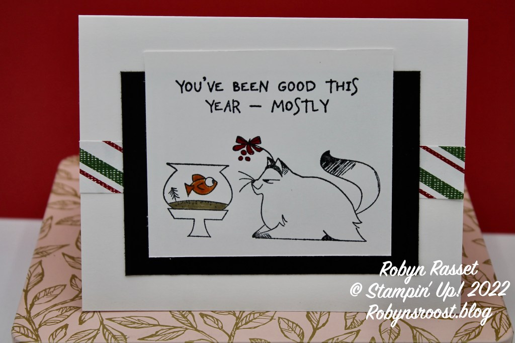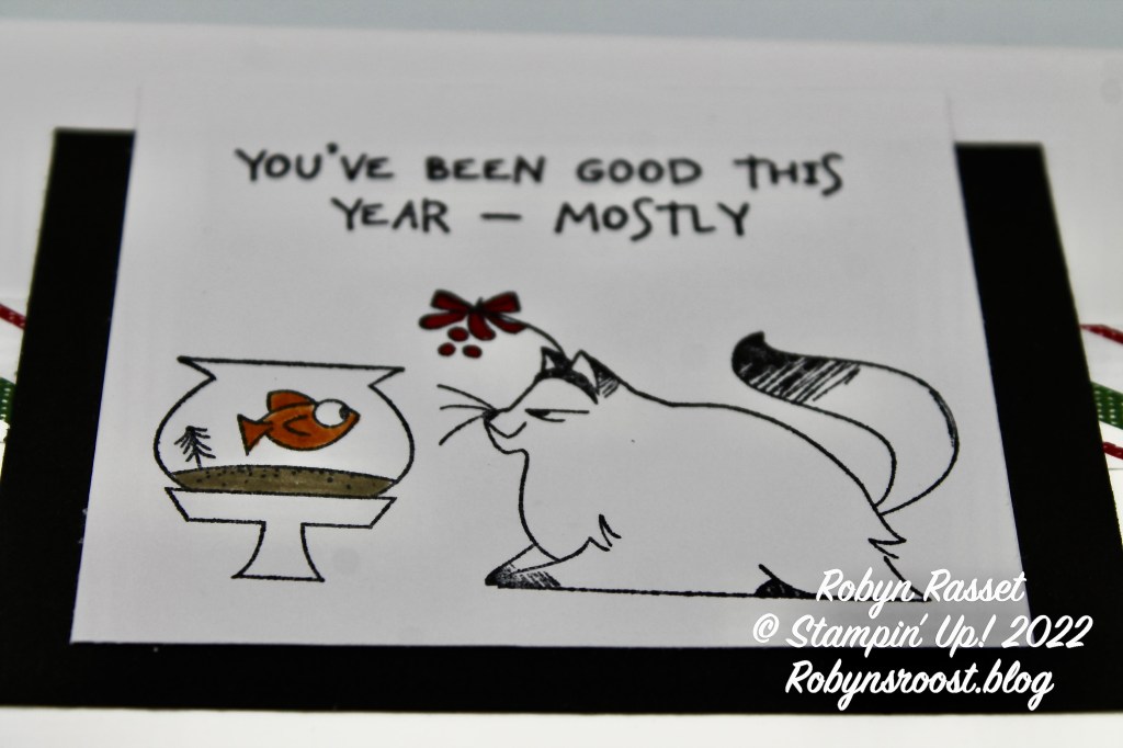 Real Red, Pumpkin Pie and Crumb Cake Stampin’ Write Markers were used to color in the items on the image. Do you think this kitty has a simple kiss under the mistletoe in mind?