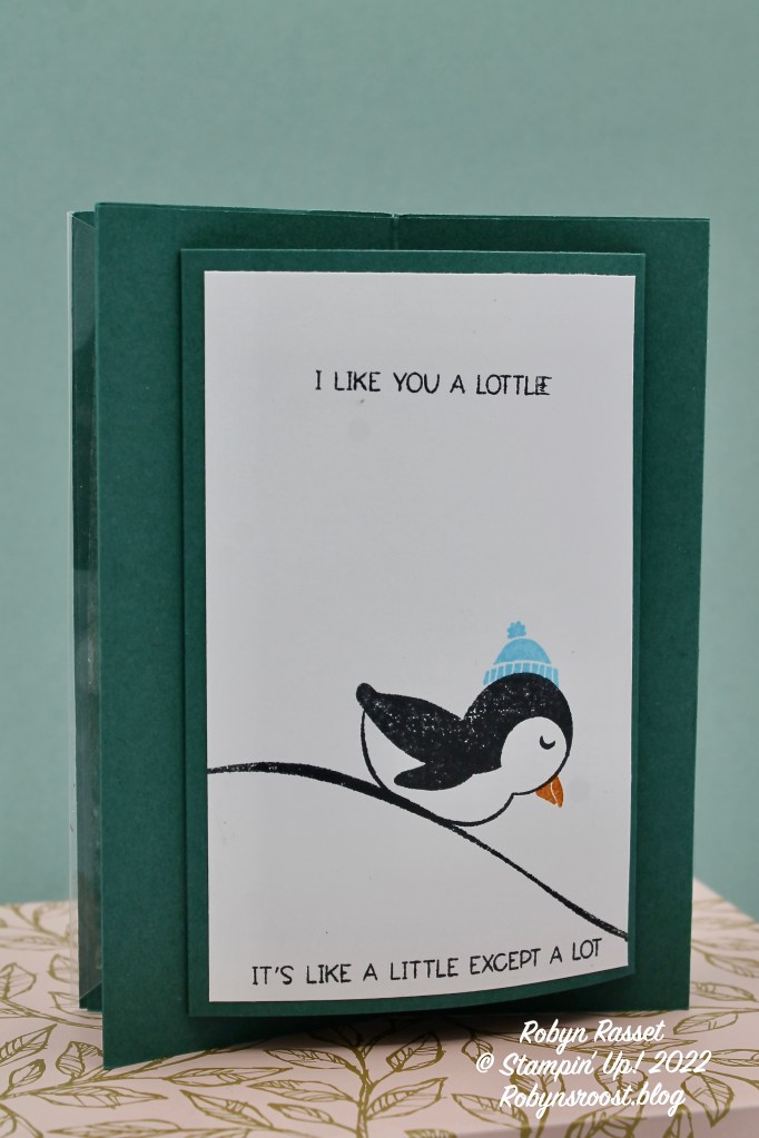 This card was a big hit at my November Creative Cards Class! It sort of makes me think of a snow globe, with the bent window sheet across the front. It’s like a cross between a tower card and a bendi card. The design is from a YouTube video by Sam Calcott of the UK, switched up to fit the US card size and my personal preference.