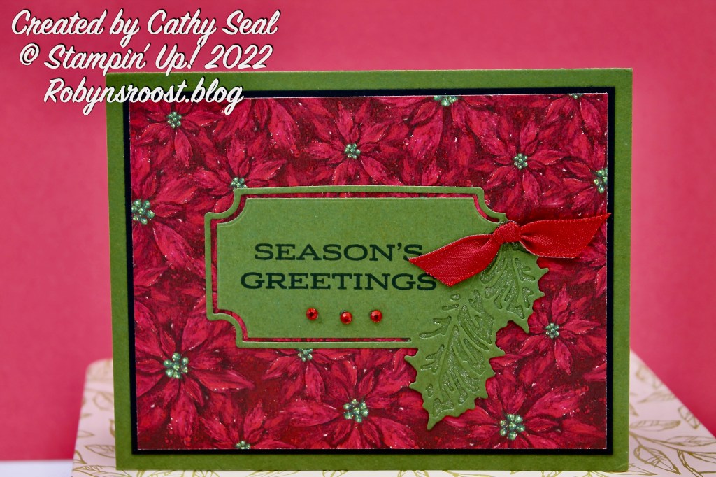 Cathy’s card also uses the Leaves of Holly Bundle with that gorgeous greeting die front and center. The pretty Boughs of Holly paper is all sold out, but darn this label would look good on top of any holiday paper.
