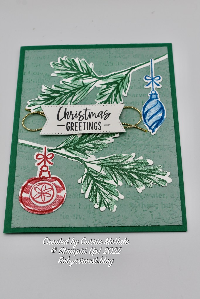 This pretty card by Carrie uses the Decorated with Happiness Bundle although the Decorated with Pines Dies are all sold out the Decorated with Happiness stamp set is still available. The two step stamps have swishes to color in the images for a fun freestyle look.