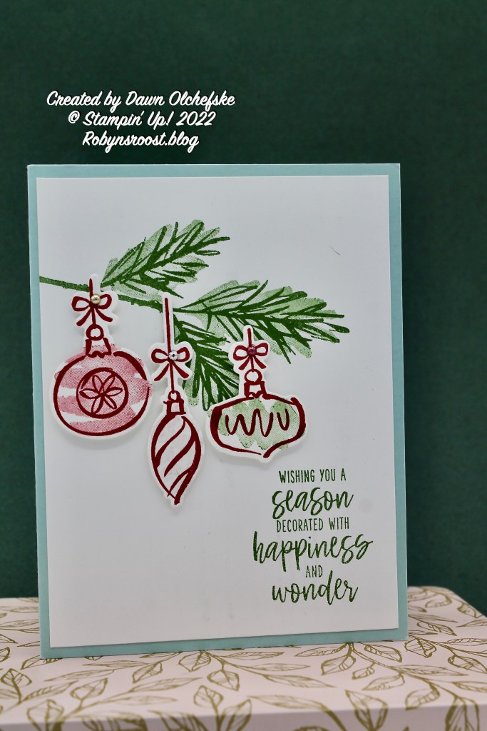This card created by Dawn Olchefski, my team leader, also uses the Decorated with Happiness stamp set. It makes me think of snow and crisp winter mornings with it’s clean white background.