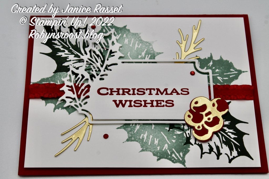 This card by Janice (we decided that our husbands are probably related somehow) uses the Leaves of Holly Bundle, which when I last checked was still available! My favorite piece in this bundle is the tag die with the holly leaves. The gold foil accents really make this card special.