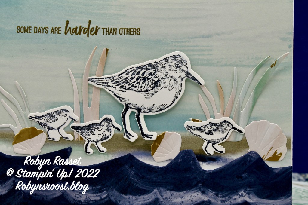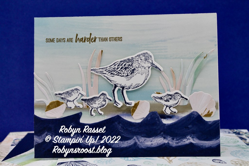 This card was a CASE from the catalog with a few tweaks. The birds are simply stamped with Night of Navy ink and die cut with the matching dies. The background is one of the ‘backsides’ of the DSP as are the waves on the bottom