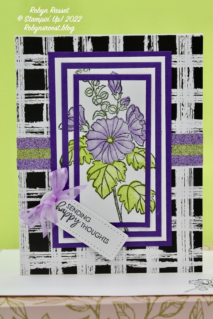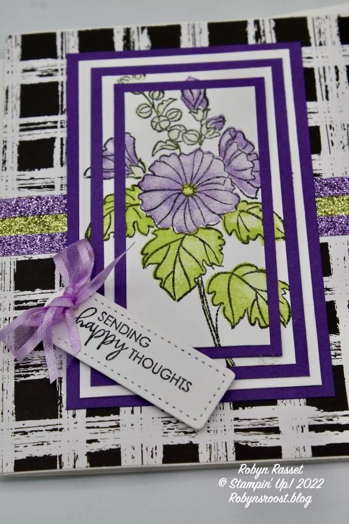 To finish the card a greeting was stamped on basic white and die cut with the one of the smallest dies in the Tailored Tags Die set with a Fresh Freesia bow to top it off. The sparkly strips are actually Washi Tape that was a Halloween pack but the Gorgeous Grape and Granny Apple colors worked well with my Highland Heather and Parakeet Party colored flowers. The Washi Tape is still available as I’m typing!