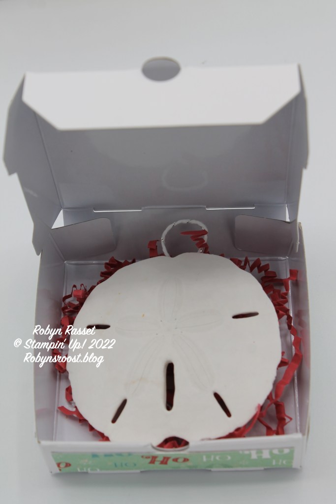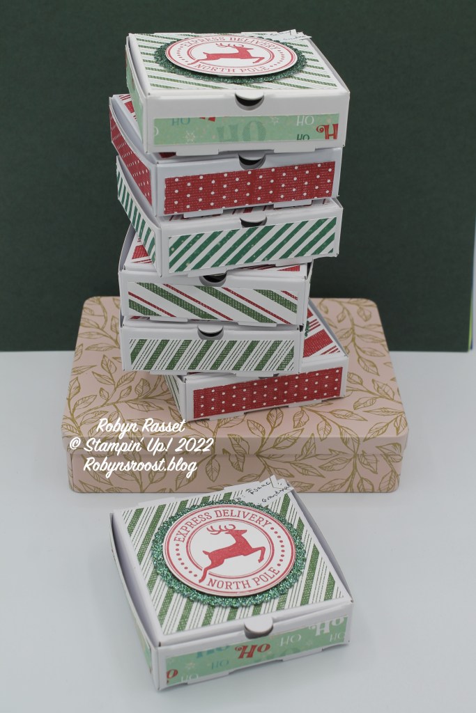 I always like to purchase the boxes that Stampin’ Up! sells and keep them on hand. I’m not a great pre-plannner, lol. These were some cool pizza boxes from a few years ago. Luckily, I had enough left for the 7 ornaments. A little crinkle paper inside, grandson Zen told me he loved the crinkle paper, and some scraps of the Santa Express and Sweetest Christmas Designer Series Paper and the boxes looked pretty festive.