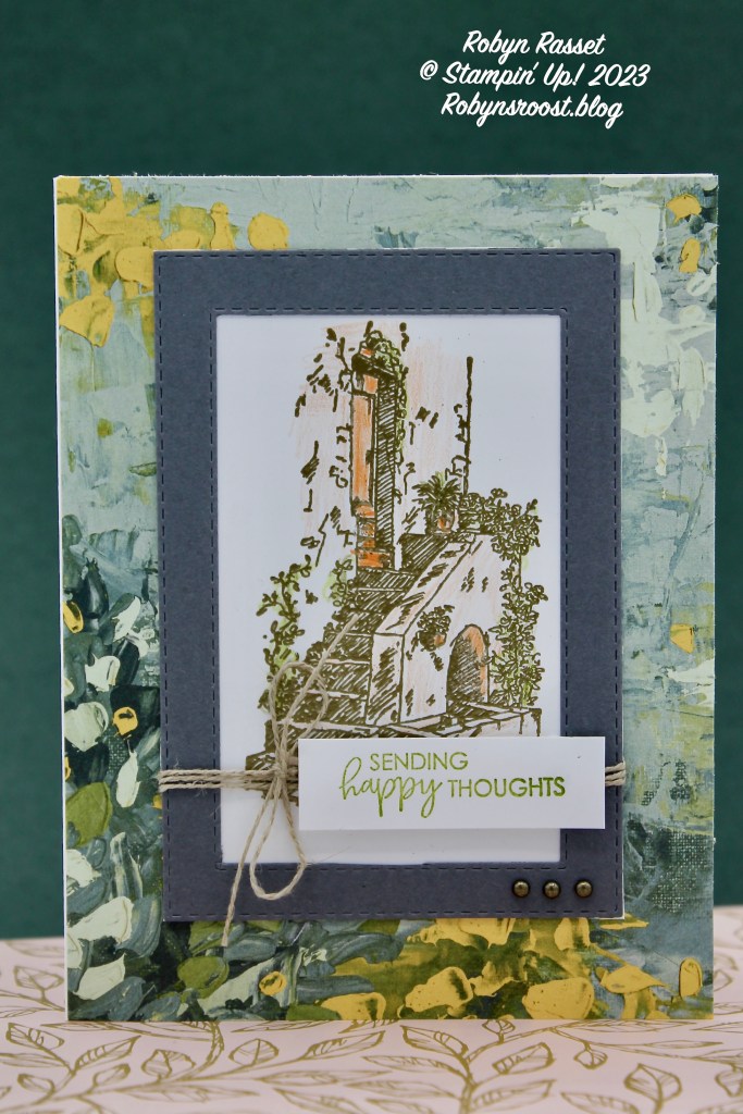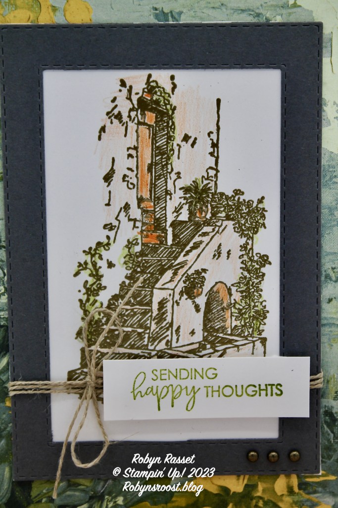 Today’s card using the In the Country SALE-A-BRATION stamp set starts with a heat embossed image. I really like coloring the image with the embossed lines much better than the no-line technique that I used on the first two cards.