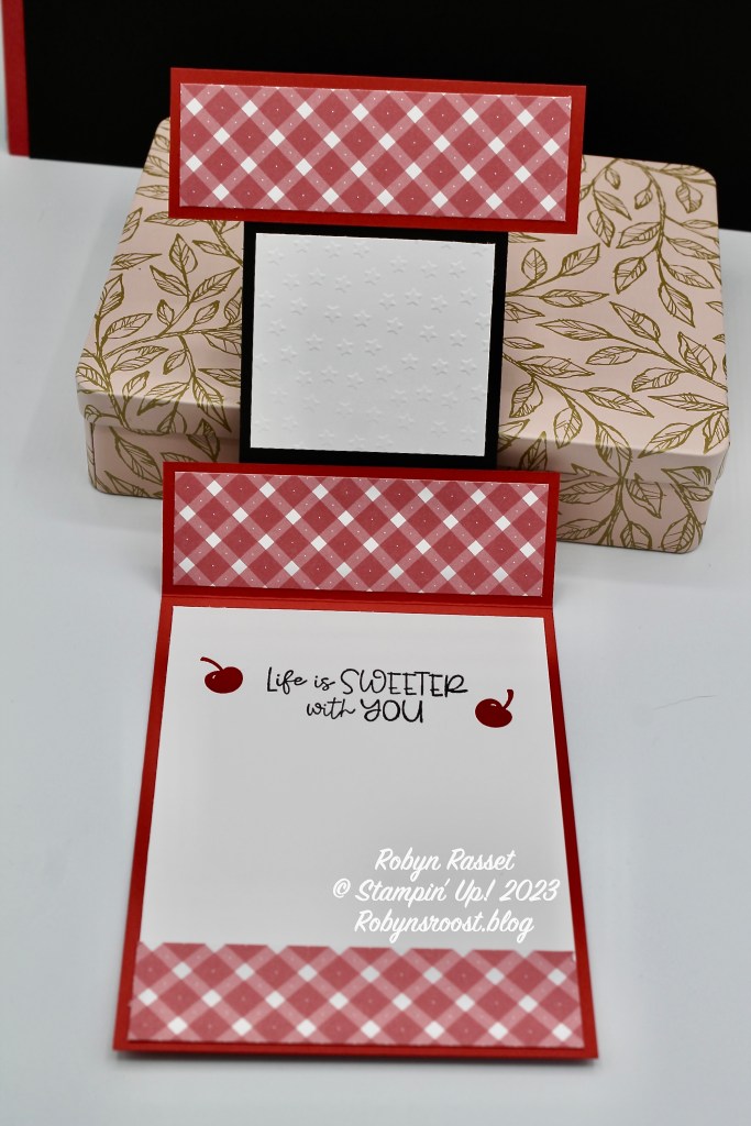 The inside is all decorated too! Although, on this card the cherry on the right side is a bit too low and shows when the card is closed. So you might want to either leave it off or stamp it higher. Watch my Split Front Card Tutorial to see this card made.
