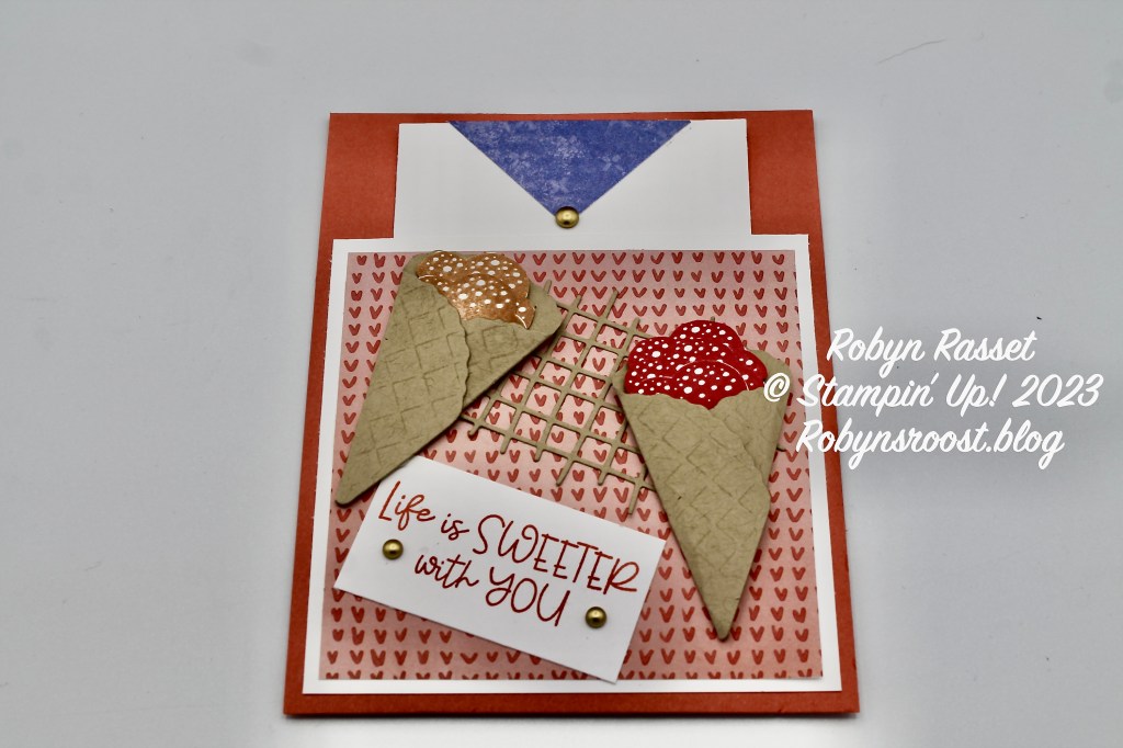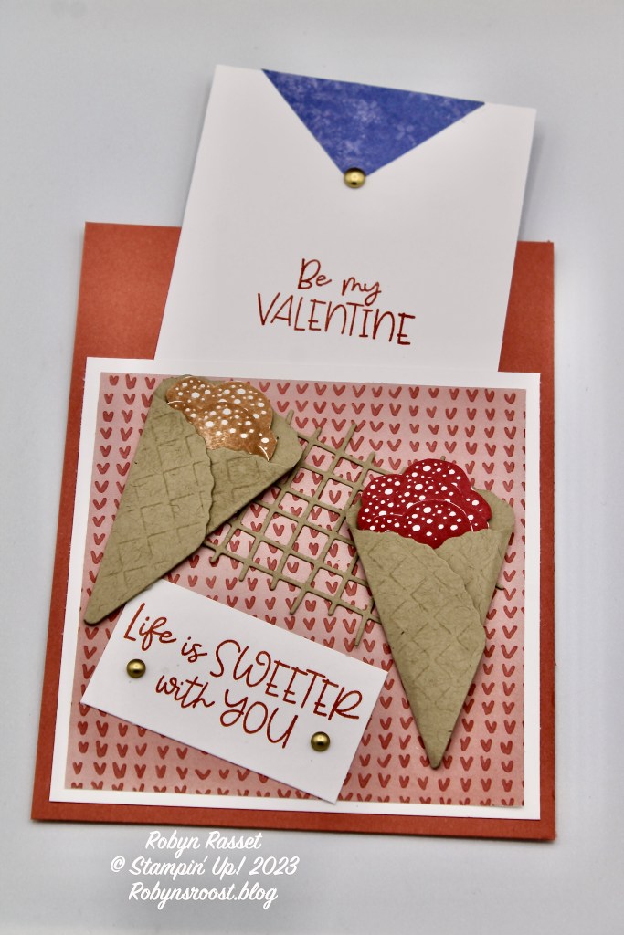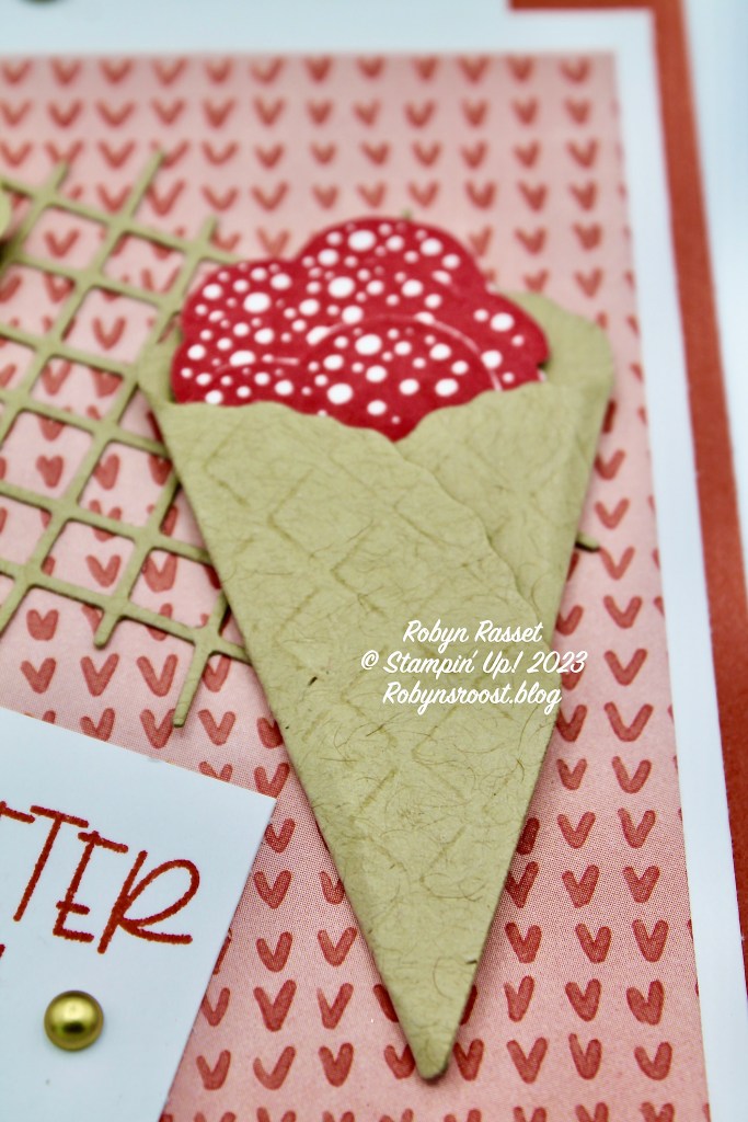 To make the waffles stand out more on the cone, use VersaMark ink and a sponge dauber to add ink to the die before cutting. I didn’t like the white lines on the ice cream so I fussy cut around the edges to remove the white edge. Probably not necessary but just personal preference. Be sure to watch my Pocket Card Valentine Video to see the card created.
