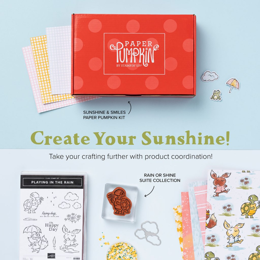 OMG! This is the best Paper Pumpkin Kit yet! It coordinates with the Playing in the Rain Bundle and has it’s own add on dies for only $6! I suggest ordering the dies right away, they are available now. It’s item 162486. Remember that Prepaid Paper Pumpkin Subscriptions qualify for SALE-A-BRATION rewards!