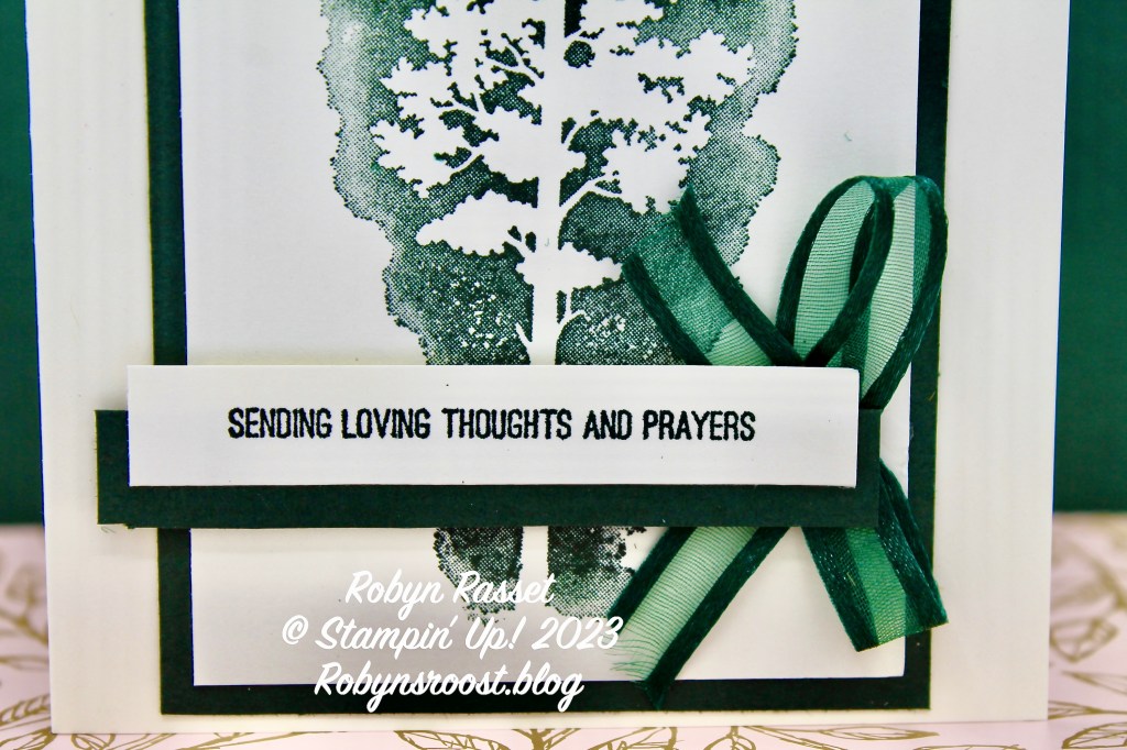 At first I tied a bow and adhered it under the greeting but it was too thick, so I simply looped the ribbon, adhering it with glue dots and then put it back under the greeting. I know that this simple card isn’t going to make things easier for my friend but I hope that she know that we are thinking about her and praying that she gets through this tough time.