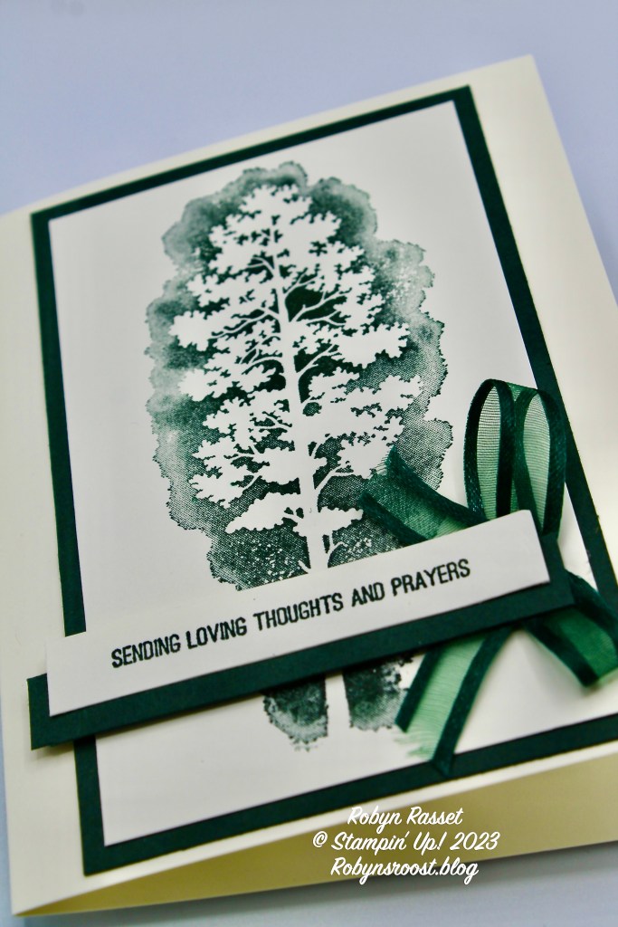 I needed a sympathy card and didn’t have any with me so thought that this layout would work well. I love the tree from the Amazing Silhouettes stamp set. The friend whose husband died is a nature lover so I thought that this card would be fitting for her. The greeting is from the Sending Support stamp set which is Free during Sale-a-bration with a $50. I absolutely LOVE this set! The greeting is adhered off center onto a strip of evening evergreen cardstock and then both pieces are popped up with dimensionals. The inside greetings are also from the Sending Support stamp set and are two of my favorites. One line is ‘somedays are harder than others’ and the next line is ‘hope today is one of the easier ones’.