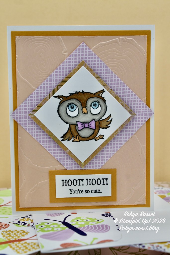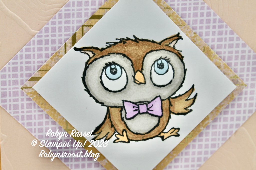 The colors on this card are from a challenge that I am participating in. They are Mango Melody, Fresh Freesia and Petal Pink. Not a color combo that I would naturally choose, but it’s nice to step outside of ones comfort zone sometimes. The Petal Pink background has been embossed with the Tree Rings Embossing Folder which was carried over from the July to December Mini catalog. The Fresh Freesia 3″ square is from the Butterfly Kisses Designer Paper Pack, which was also used on the envelope flap. The narrow layer behind the owl is from the Texture Chic Paper Pack and pulls in some more Mango with a bit of foil too.