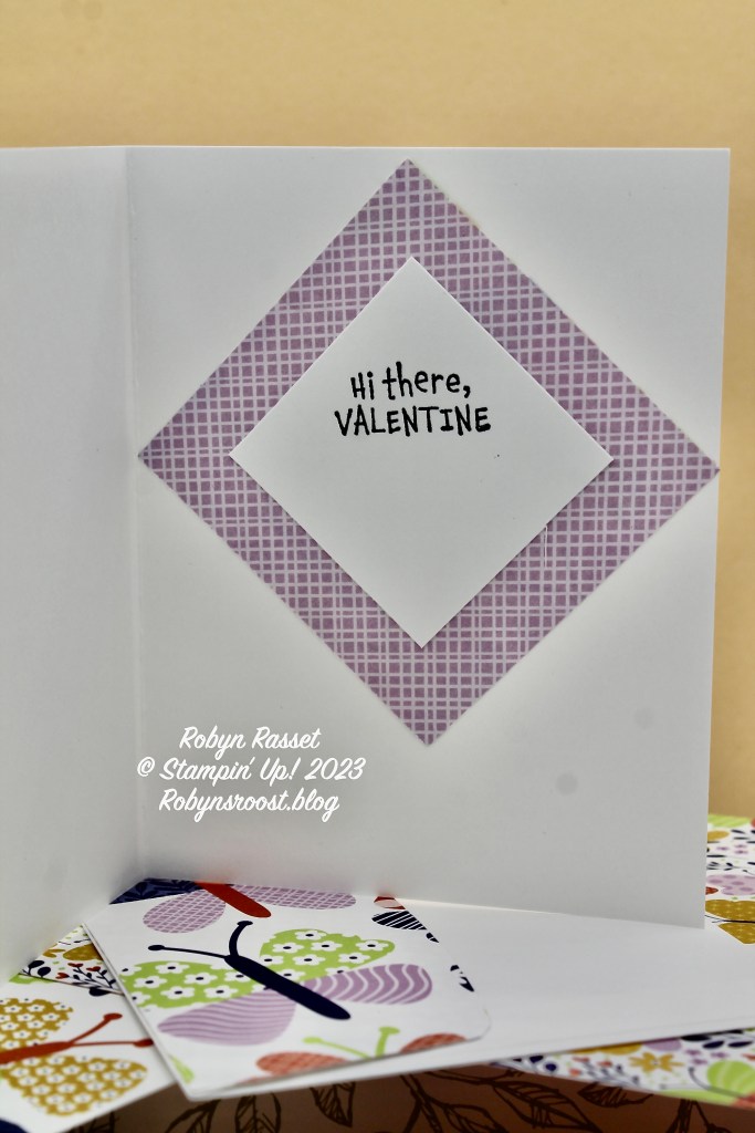 For the inside another 3″ square of the Butterfly Kisses paper was used and a 2″ square of Basic White. The Valentine greeting is from the Love Cats stamp set (another adorable critter set!).