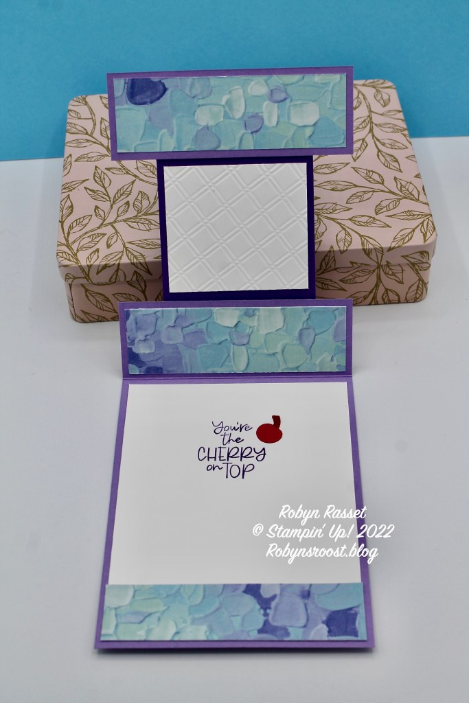 The fun Fancy Flora patterned paper continues on the inside. It makes me think more of oil paint or brush strokes than flora but I guess there are lots of oil paintings of flora. If you want detailed directions for creating this card layout be sure to watch my Split Front Fun Fold Video. Of course the card created on that video is a red Valentine.