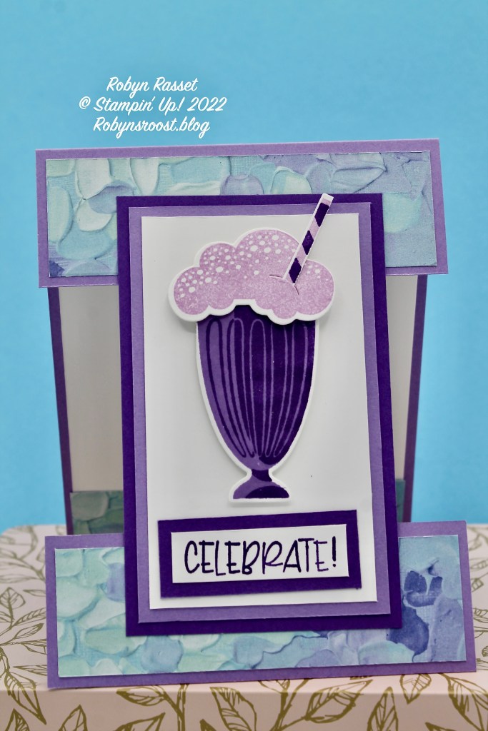 I did share this same card a few weeks ago done in my more usual reds, but this is actually the first card that I created using this design layout. My Daughter-in-law, Karissa, loves purple so this card was created with her in mind. Karissa, do you like grape milkshakes, lol?