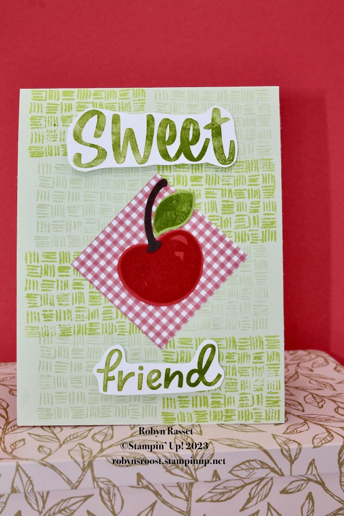 The Sweetest Cherries stamp set and punch bundle makes me think picnic! At home in Minnesota January isn’t a month usually associated with picnics, but I grew up in a family that would pack up picnic gear onto a snowmobile and head out into the woods on a warm (say 20°) winter day. Even my grandma would hop on. It’s funny but today, here in our Florida winter home, the temp is in the mid 60″s and it feels cool to me. I guess it’s all in the contrasts!