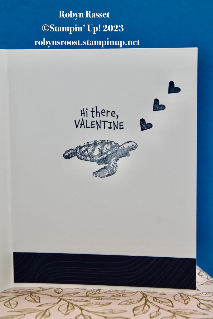 For the inside of the card, a greeting and some hearts were pulled in from the Love Cats stamp set with a strip of the ocean paper on the bottom.
