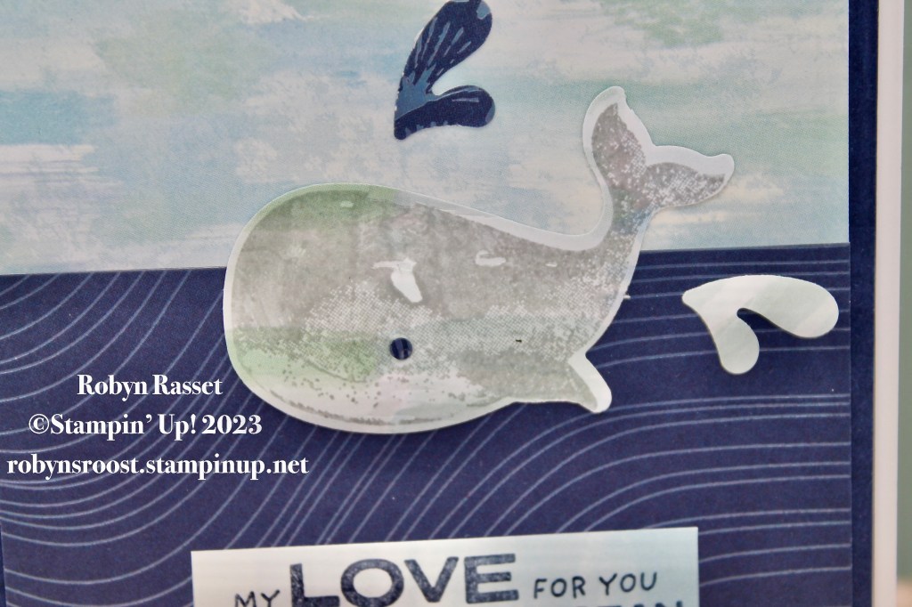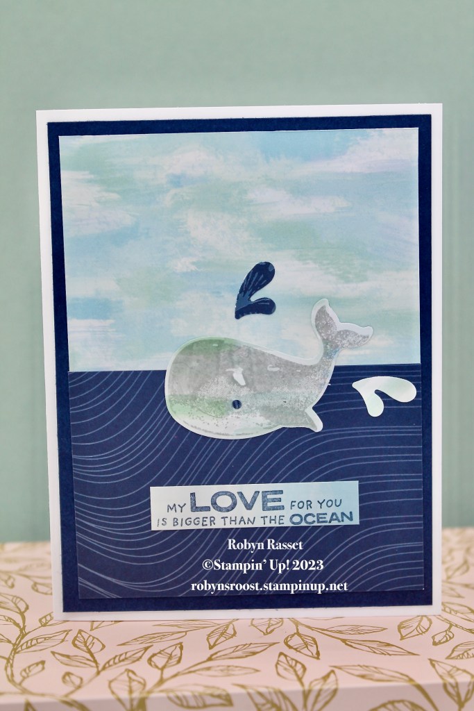 The whale was stamped with Basic Gray ink onto a piece of the designer paper and then punched out with the Whale Builder Punch. A piece of the same paper is used on the upper background, while another pattern created the ocean on the bottom. The greeting is stamped on a scrap of the same paper as used for the whale with Night of Navy ink.