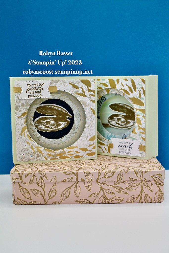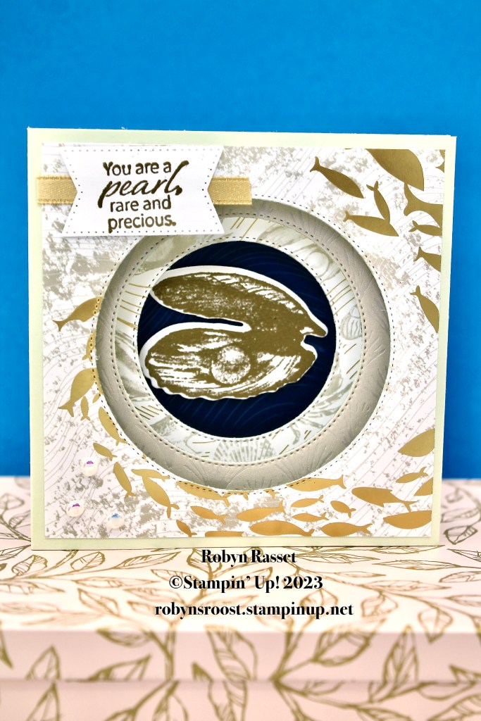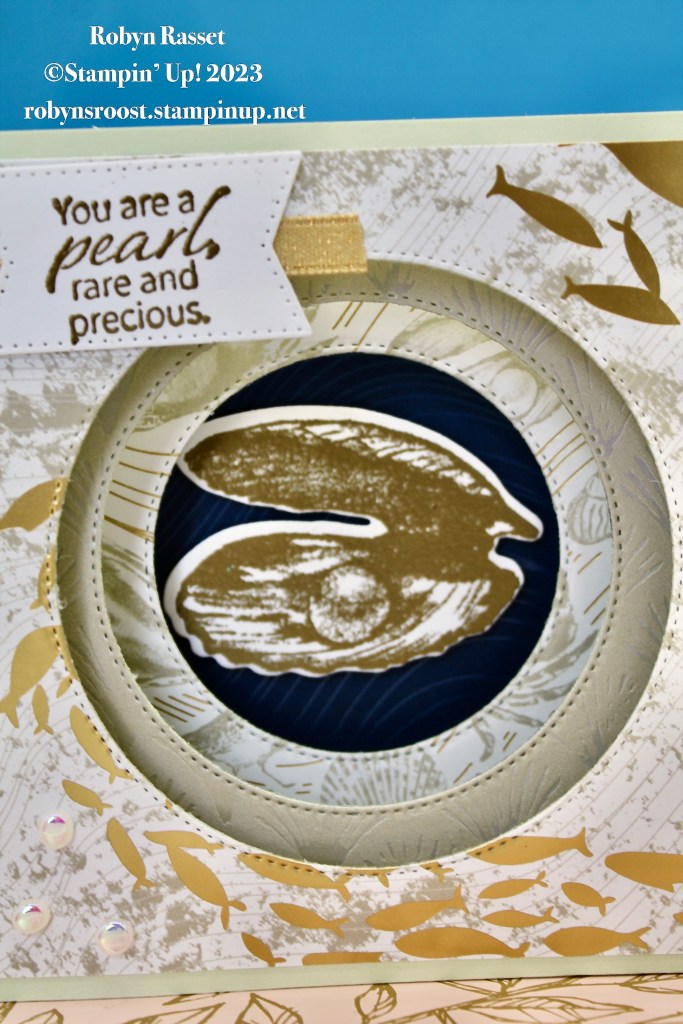 The clam and the greeting are heat embossed with gold embossing powder to match the foiled papers from the By the Sea Designer Series Paper pack.