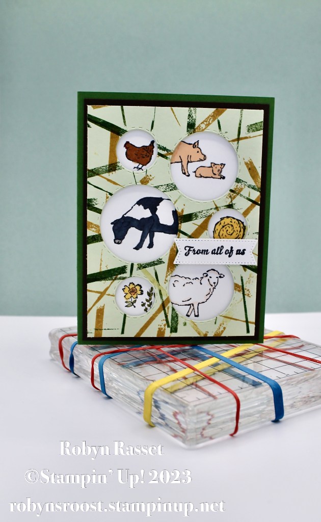 I chose the On the Farm stamp set for my rubber band card and went with greens and yellows for a grassy, hayish feeling. The rubber band layer was oversized and then trimmed to 3 3/4″ x 5″ and matted with a 4″ x 5 1/4″ piece of Early Espresso cardstock. The rubber band layer is done on a Soft Sea Foam cardstock and the bands were first inked with Garden Green, cleaned and then done with Crushed Curry. The windows were die cut with the Picture This die set which is a larger die that cuts the circles all at once. The set also contains another die that cuts rectangles.