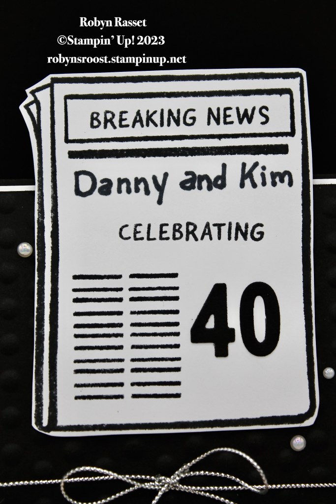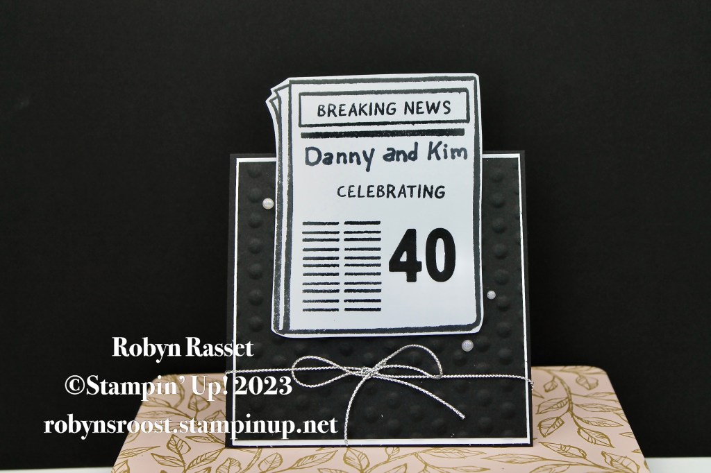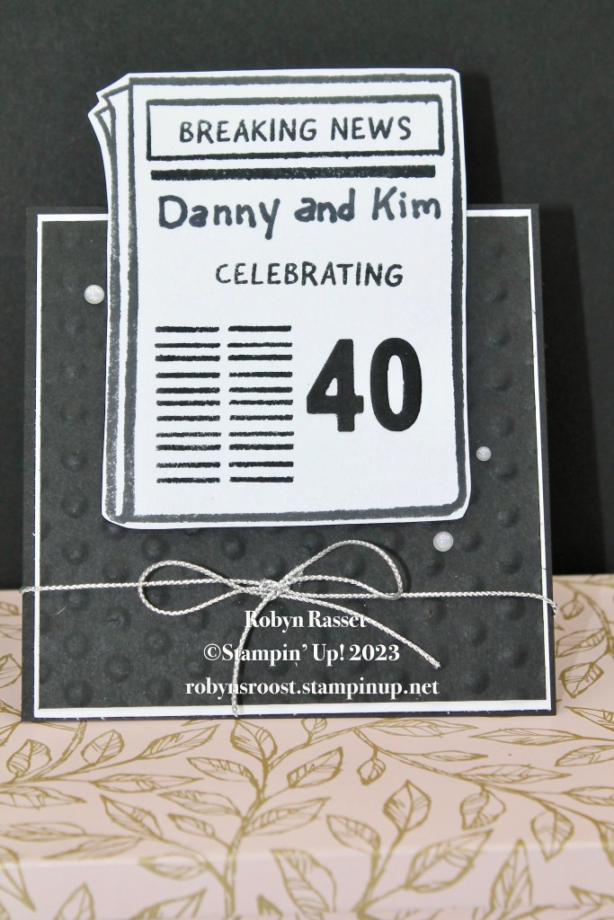 I love the newspaper stamp that is the main stamp in the Breaking News Photopolymer stamp set! The only class that I ever got a D in was penmanship, can you tell? I printed the couple’s names to personalize the card. The 40 is die cut from a retired die set, the Little Numbers Dies. Stampin’ Up! doesn’t currently have a number die set but there is a stamp set called Alphabest that contains both numbers and letters and can be purchased as a Bundle with a cute punch called the Best Label Punch that fits the stamps.