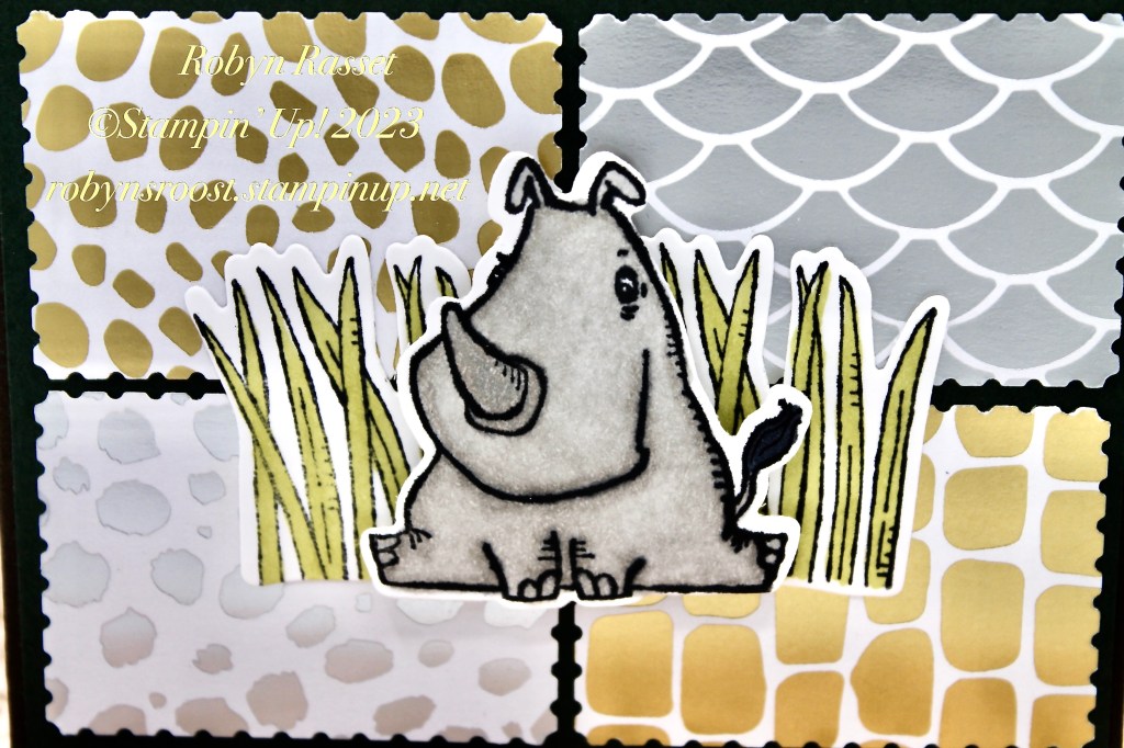 By the way, have you seen this new On-line exclusive, Rhino Ready stamp set with matching dies? These guys are so CUTE! I’ve stamped 2 clumps of grass, colored them with an Old Olive Stampin’ Blend Marker and die cut to place behind the main image. Then the sitting rhino is colored with Gray Granite Stampin’ Blends. The card base is Early Espresso.